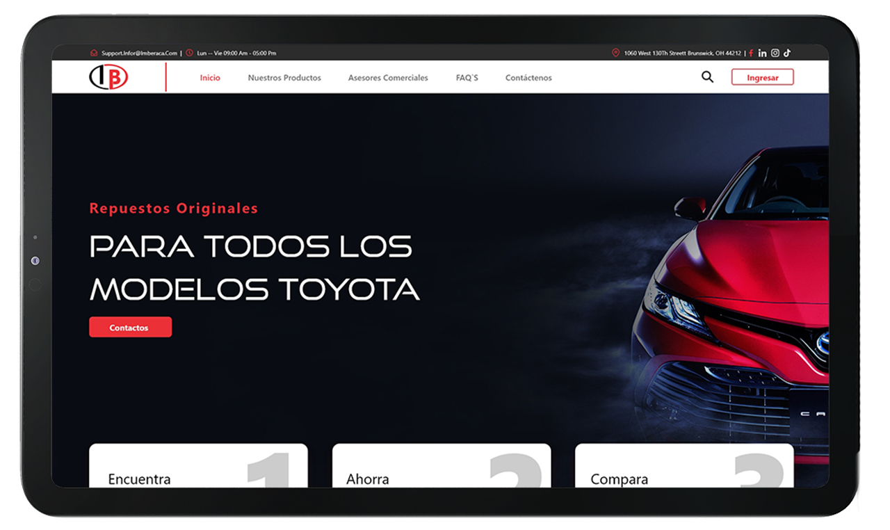 Landing para la empresa de repuestos automotriz Imberaca, contando con un Dashboard de gestión de mercancía y facturación para facilitar el trabajo a los promotores.