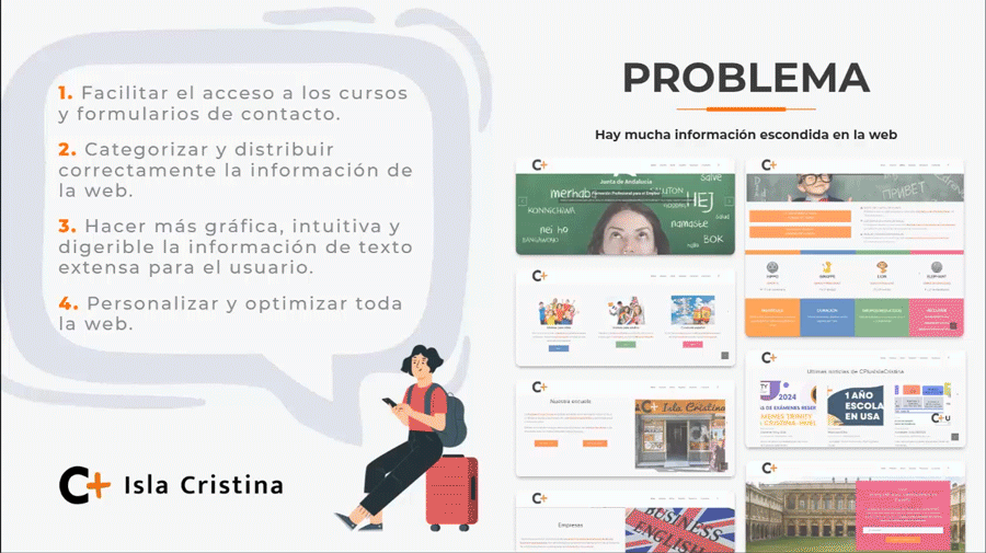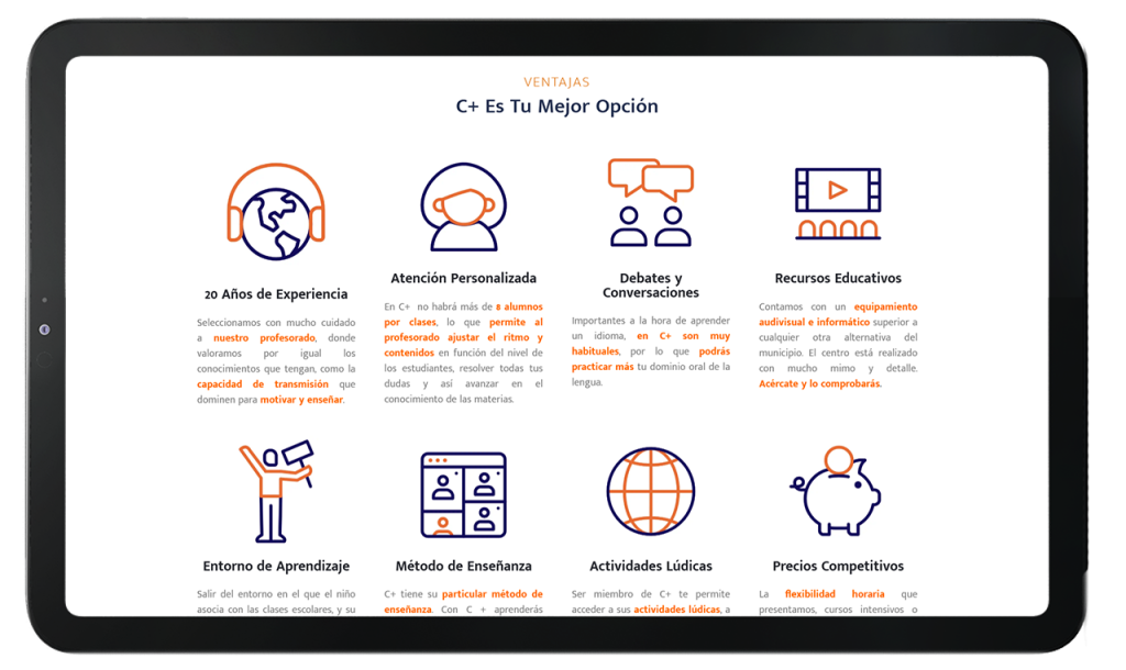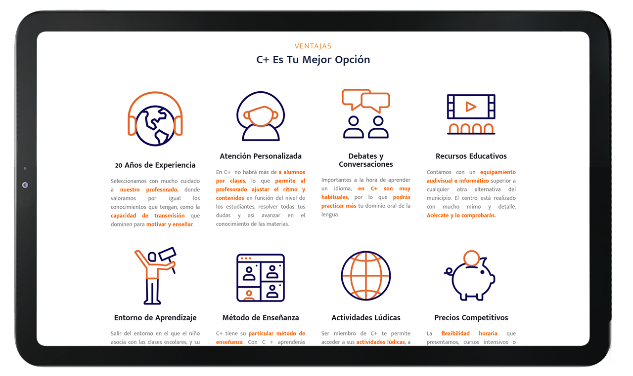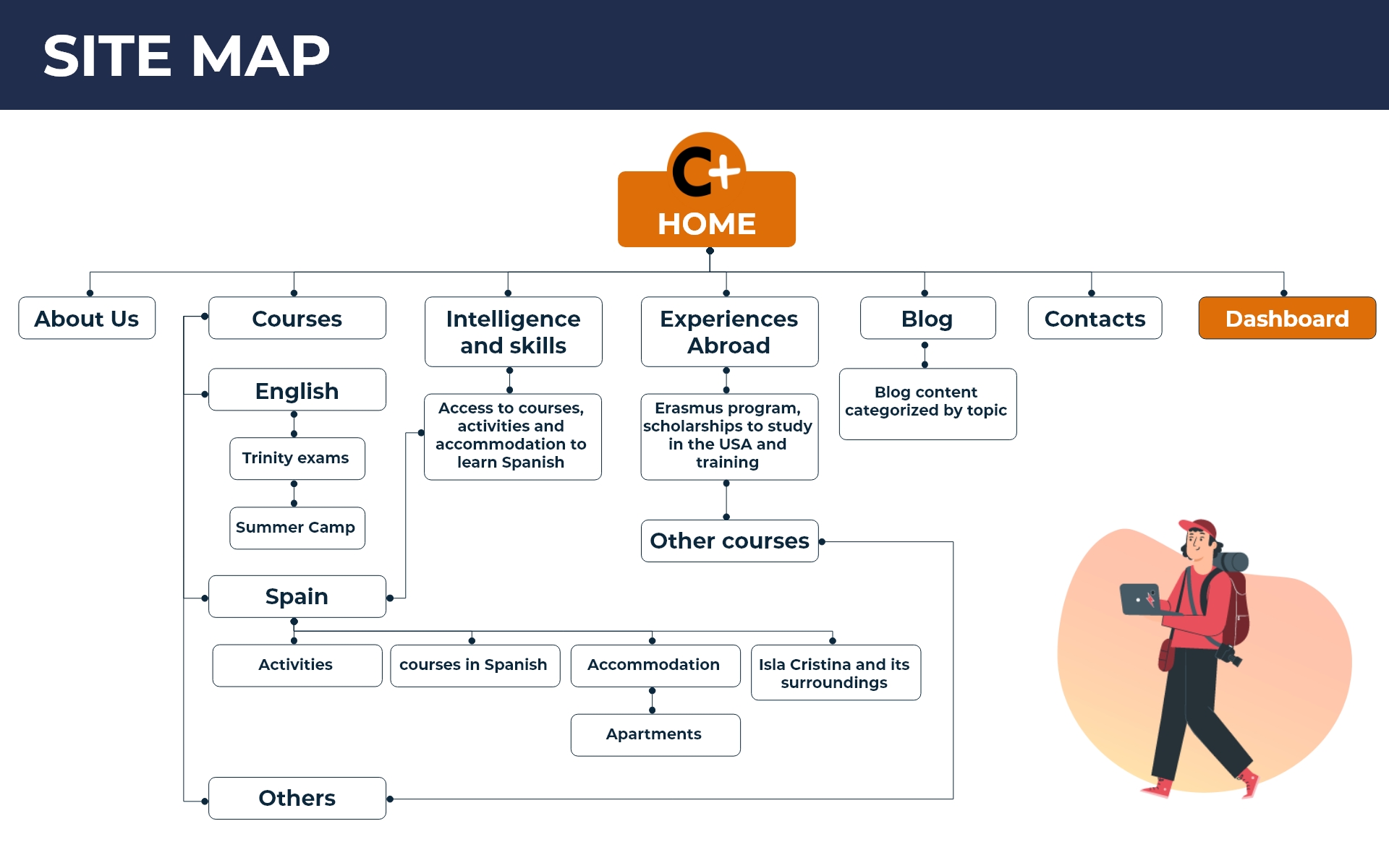 Restructuración de la web de idiomas Cplus. Reorganización del contenido existente e implementación de una buena Arquitectura de Información (AI), como parte del Kit Digital de España.